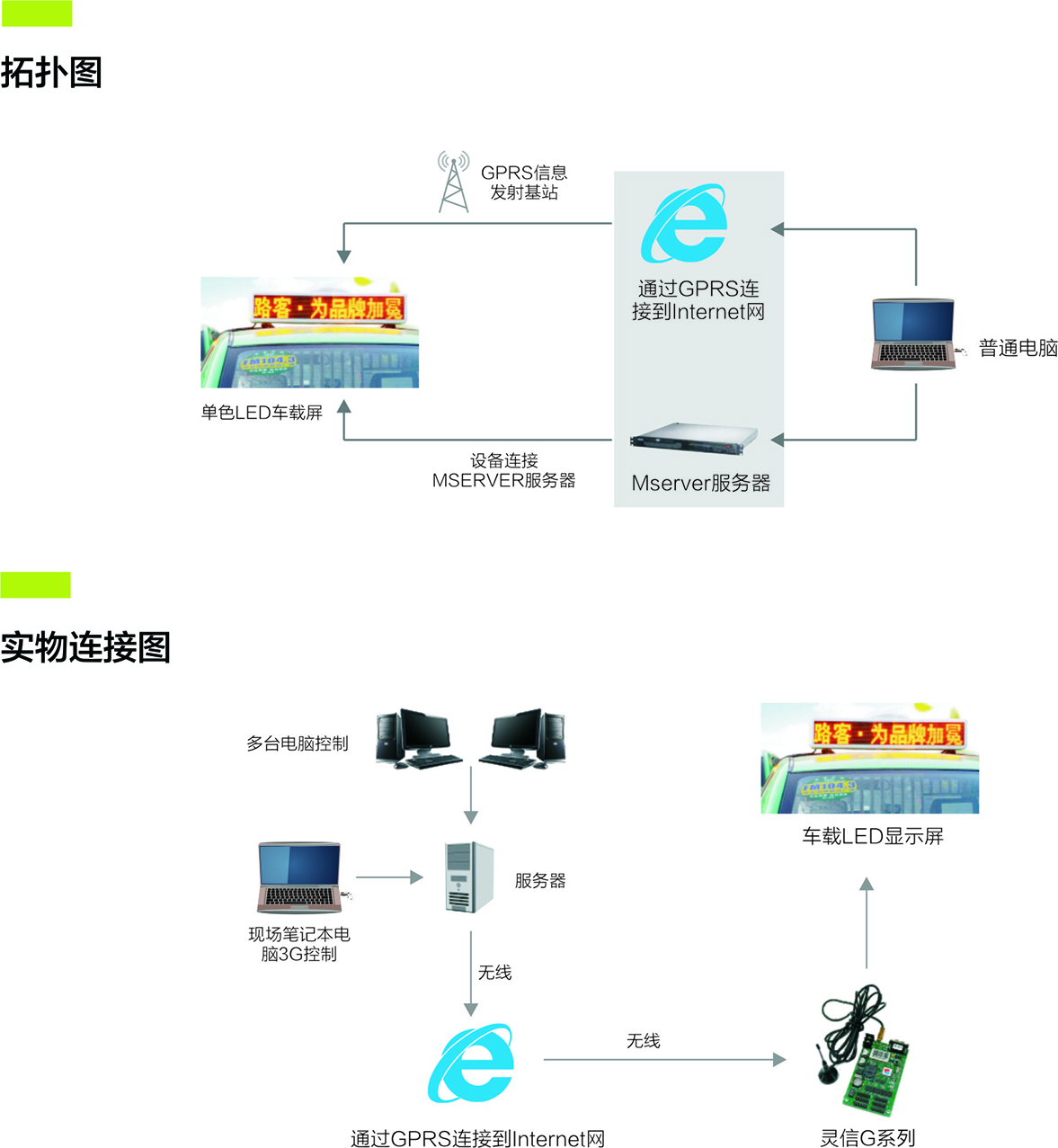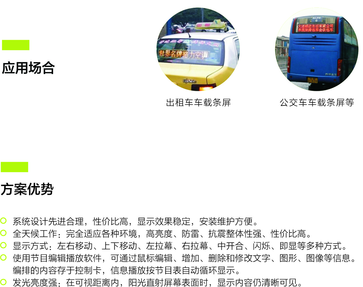 出租車車載無線LED顯示屏系統(tǒng)主要由車載LED顯示屏、無線LED控制卡、LED顯示屏控制軟件組成。配合城市出租車管理系統(tǒng),可以顯示車輛信息,線路以及氣象,公告,廣告等媒體信息。