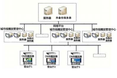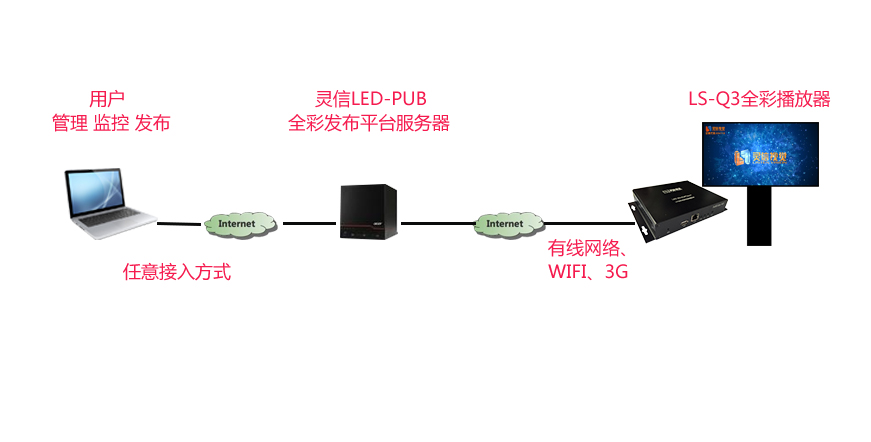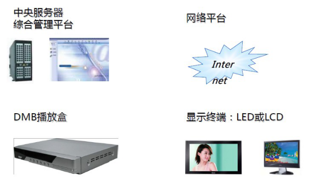 聯(lián)網(wǎng)系統(tǒng)由管理中心、網(wǎng)絡(luò)平臺、LED高清播放器和LED顯示終端四部分組成。
