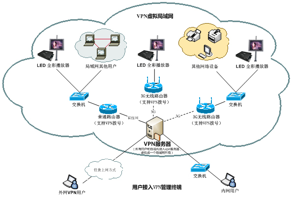 對于一百套以內(nèi)終端,網(wǎng)絡(luò)環(huán)境不復(fù)雜的情況,可以選用單機(jī)版+VPN方案。VPN技術(shù)需要提供一個(gè)公網(wǎng)IP,可以將非局域網(wǎng)環(huán)境的各個(gè)終端虛擬成一個(gè)局域網(wǎng)環(huán)境,然后利用局域網(wǎng)內(nèi)占優(yōu)勢的單機(jī)版軟件進(jìn)行便捷的配置、發(fā)布操作,結(jié)合單機(jī)版軟件便捷和網(wǎng)絡(luò)版異地管理的優(yōu)點(diǎn),同時(shí)也提供并發(fā)功能和簡單的權(quán)限管理。