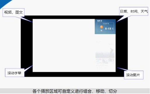 一個(gè)屏幕可同時(shí)播放視頻(小品、幽默片)、圖片、時(shí)間、天氣、新聞、滾動字幕、企業(yè)等多組信息。解決內(nèi)容關(guān)注度的問題,觀眾總能從屏幕上各取所需。