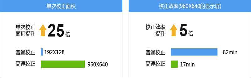 對于校正耗時,以960X640的顯示屏為例,普通的校正模式下,需要82分鐘,采用高速校正,僅僅需要17分鐘,校正速度提升5倍!